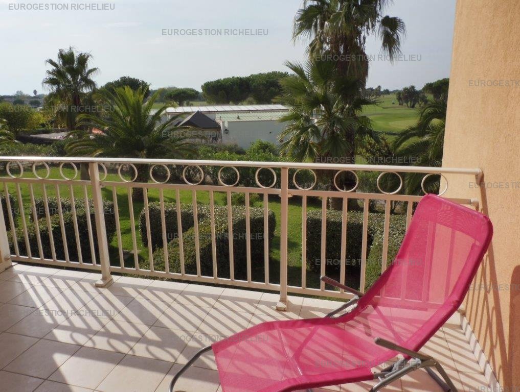 PALMYRA GOLF - Appartement n. 206 - 3 PIECES de 47m2 avec loggia de 11m2. Avec parking 14. 2e étage avec ascenseur. Vue golf et espaces verts. Expo: Ouest. Séjour, coin cuisine, 2 chambres, salle de bains, WC séparés et loggia. AVEC CLIM REVERSIBLE. COUCHAGES: 6 pers. max. CHAMBRE 1: 1 Lit 2 personnes. CHAMBRE 2: 2 lits 1 personnes. SEJOUR: 2 Lits gigognes. COIN CUISINE: 4 Feux vitro-céramiques, réfrigérateur avec partie congélateur, lave-linge, lave-vaisselle, mini-four, micro-ondes. TV. SANITAIRES: Salle de bains avec baignoire et lavabo, WC séparés. Résidence avec piscine couverte et chauffée face au golf et à 800m de la Plage Richelieu. L'ouverture de la piscine est soumise à l'autorisation de la copropriété et est ouverte normalement de mi juin au début septembre. Une caution est exigée dÂ’un montant de 400 € par carte bancaire (Visa ou Euromastercard). --- Les clients/occupants âgés de moins de 18 ans doivent être accompagnés d'un parent ou d'un tuteur lÃ